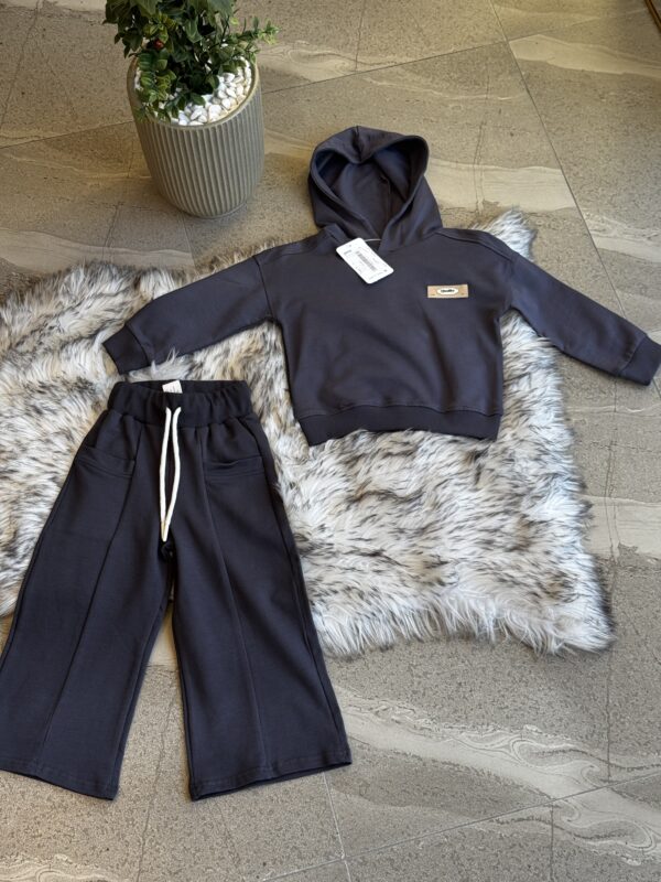 الطقم باللون الرمادي الداكن، وهو لون محايد يناسب جميع الإطلالات ويوفر مظهرًا عصريًا وأنيقًا للأطفال.